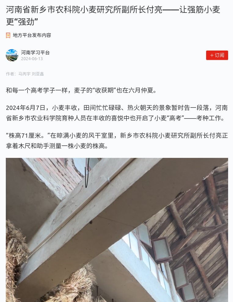 【河南日报】河南省新乡市农科院小麦研究所副所长付亮——让强筋小麦更“强劲”