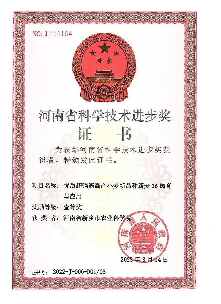 新麦26科技进步奖证书 新乡市农科院 供图