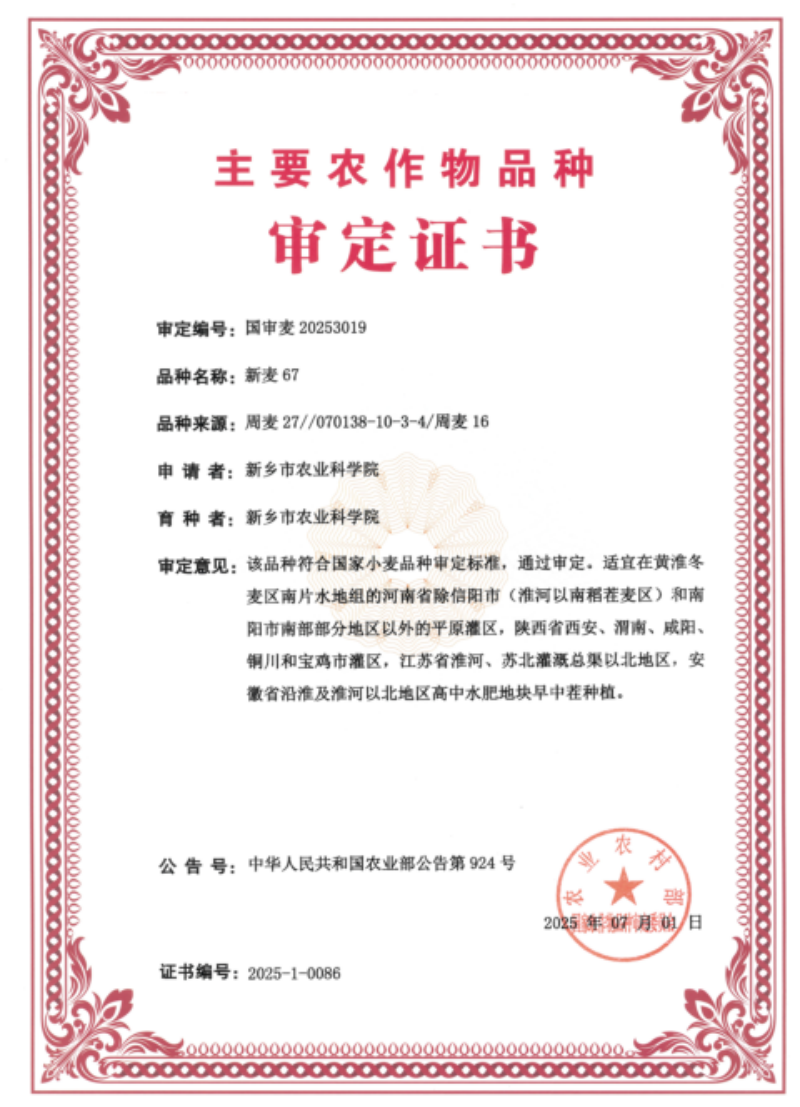 产量表现:2021-2022年度参加国家小麦育种联合攻关黄淮冬麦区南片水地组区域试验,平均亩产564.6千克,比对照周麦18增产8.00%;2022-2023年度续试,平均亩产616.5千克,比对照周麦18增产7.00%;2023-2024年度生产试验,平均亩产565.2千克,比对照周麦36号增产4.86%。